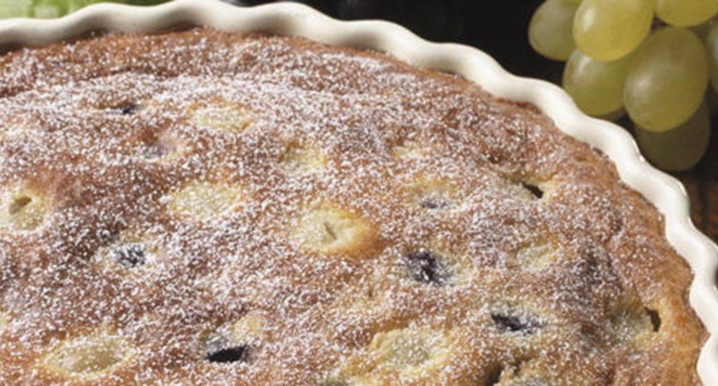 - Unte uma forma de louça, com cerca de 20 cm de diâmetro, com margarina Vaqueiro. Espalhe sobre o fundo as uvas e cubra com o preparado anterior.