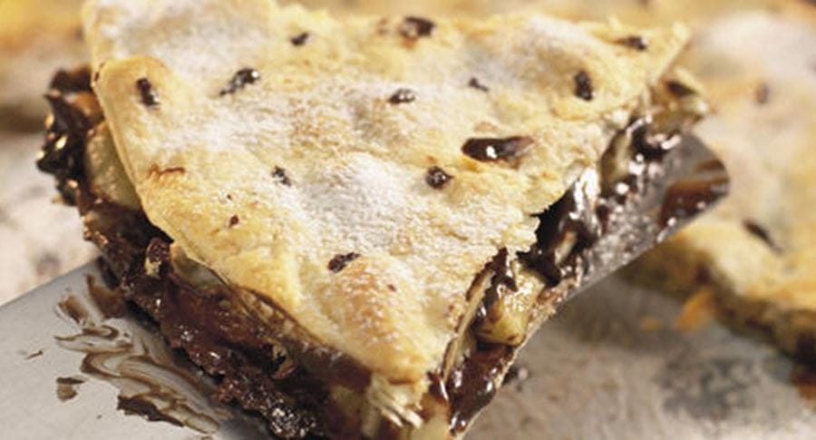 - Entretanto, desenrole uma das placas de massa, mantendo-a sobre o papel. Sobre ela disponha as bananas cortadas como quiser. Regue com o chocolate derretido e cubra com a outra placa de massa. Pique a massa com a ponta de uma faca afiada e leve ao forno durante 15 a 20 minutos.