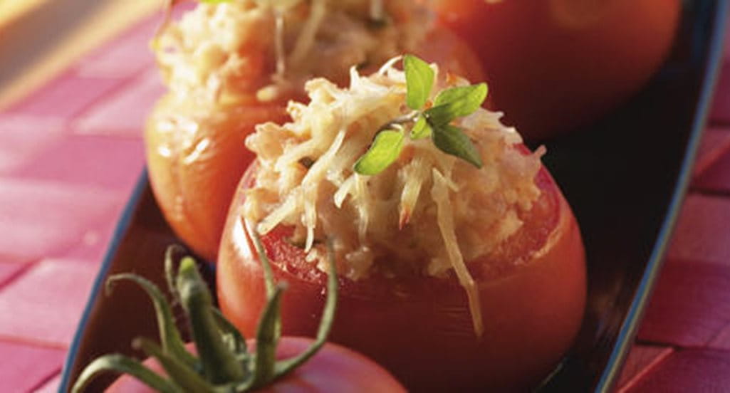 - Lave os tomates e corte-lhes uma tampa. Escave o interior cuidadosamente, elimine as grainhas e pique a polpa. Apare a côdea às fatias de pão e demolhe-as com um pouco de leite. Esmague-as com um garfo e misture com o queijo mozzarella em fios, o paio picado, o tomate em bocadinhos e os orégãos. Recheie os tomates com este preparado. Coloque-lhes as tampas e pique a pele aqui e ali com um palito. Coloque num prato untado com margarina Vaqueiro e leve ao micro ondas durante 3 minutos.
