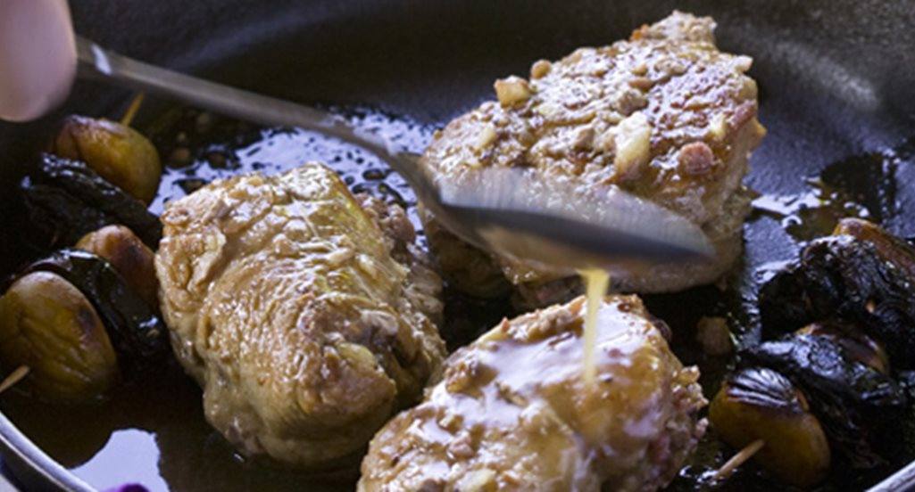 Tornedó de porco com recheio de ameixas e castanhas e espuma de ameixa