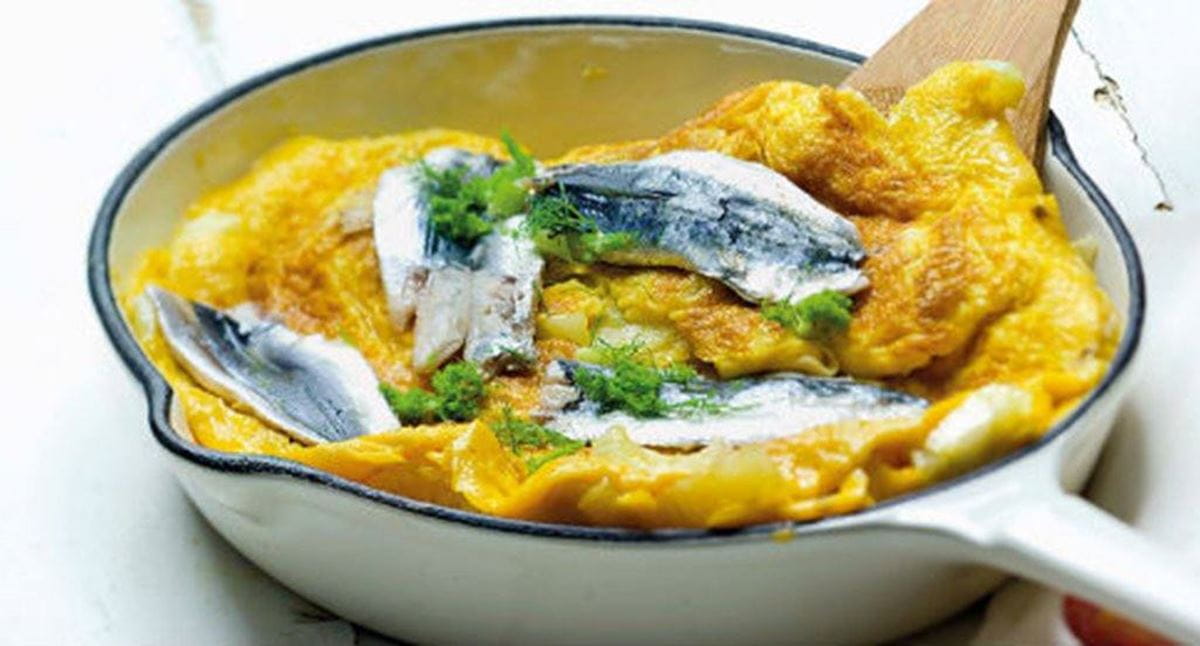 - Depois de pronta ponha a tortilha no prato de servir, enfeite com os filetes de sardinha marinados e salpique com salsa picada.