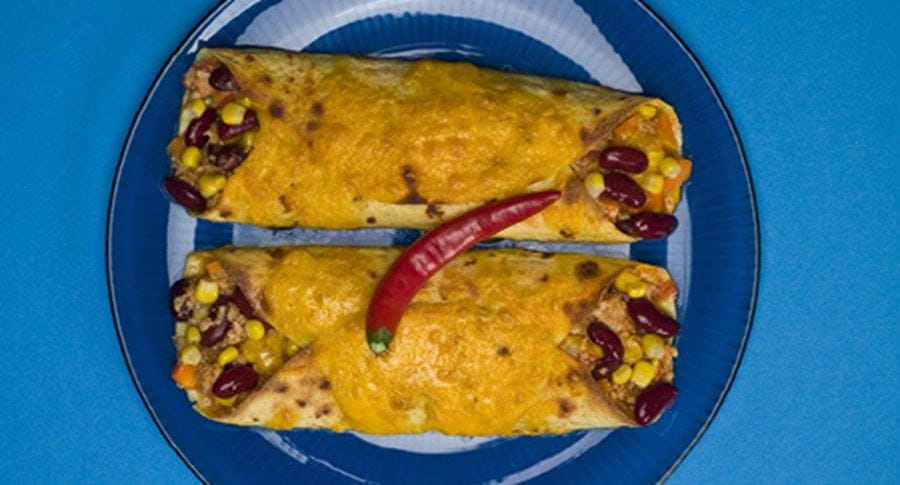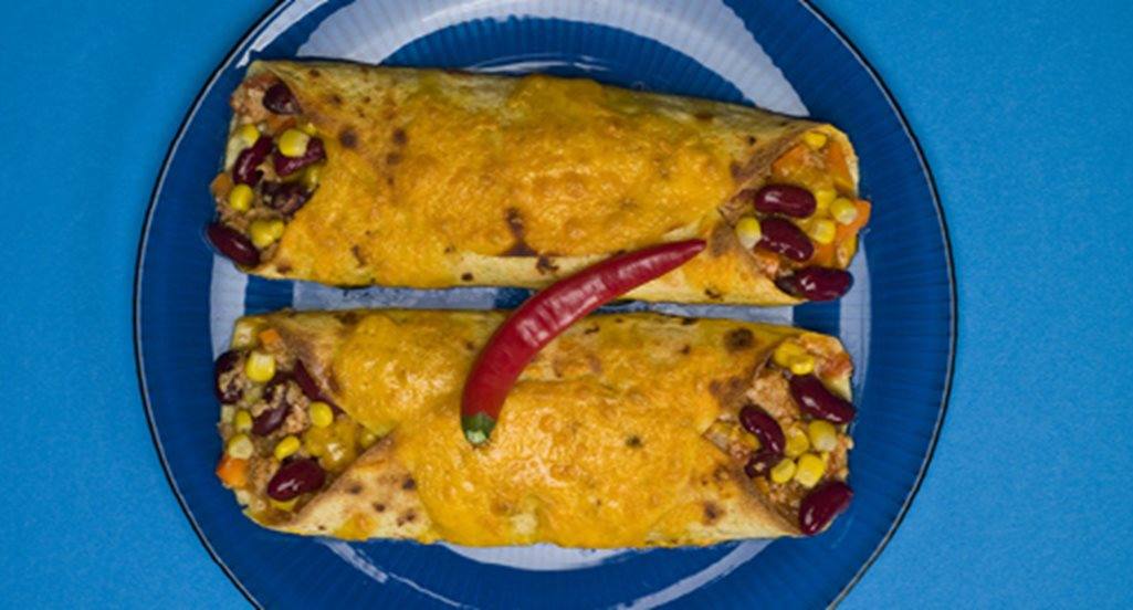 - Distribua o recheio pelas tortilhas, enrole e coloque-as num tabuleiro de forno. Salpique com queijo Cheddar ralado e leve ao forno com o grelhador ligado até o queijo derreter.