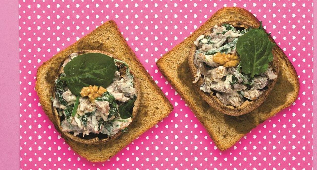 - Distribua o cozinhado pelos chapéus dos cogumelos, coloque-os sobre as fatias de pão tostadas e sirva sem demora.