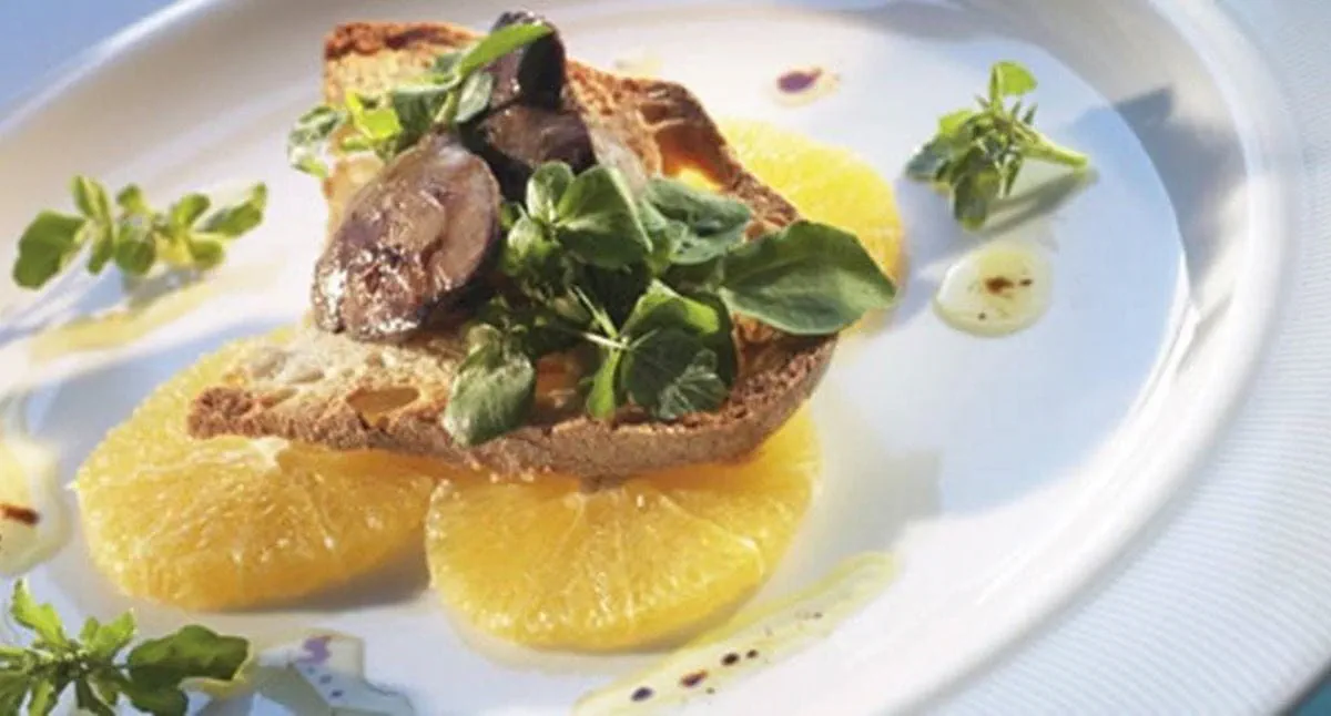 - Descasque as laranjas ao vivo, corte-as em rodelas e disponha-as nos pratos ao lado das tostas preparadas.