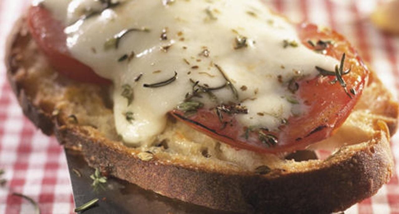 - Distribua as rodelas de tomate pelasfatias de pão,por cima coloque as rodelas de queijo, polvilhe com as ervas aromáticas, sal e pimenta eleve de novo aogrelhador do forno até o queijo começar a gratinar.