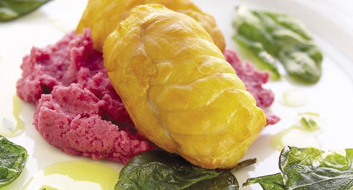 - Sirva os lombos de tamboril sobre o puré rosado, regados com o azeite aromatizado e acompanhe com os espinafres crocantes.
