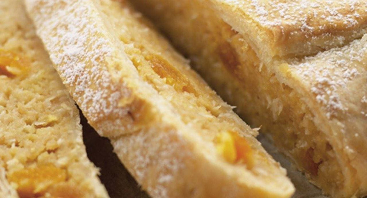 - Disponha o preparado de coco e maçãs no centro da massa. Dobre as pontas da massa sobre o recheio de modo a cobri-lo completamente.