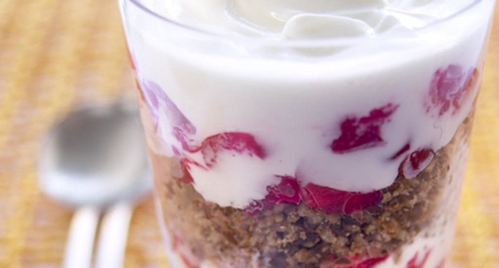 - Distribua em camadas alternadas o creme de queijo, a mistura de pumpernickel e as cerejas.