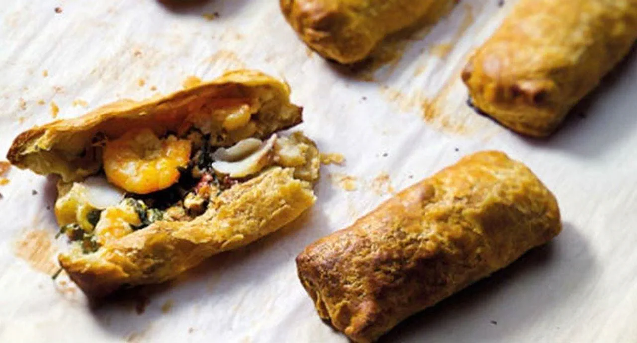 - Distribua o recheio de bacalhau sobre os quadrados de massa folhada, molde em rolo ao centro e enrole na massa.