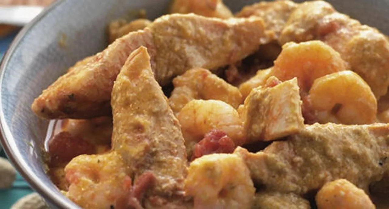 - Ponha o peixe e respectiva marinada noutro tacho, junte o tomate e cerca de um copo de água e leve a ferver cerca de 5 minutos. Entretanto, triture com a varinha mágica o camarão seco fervido, juntamente com o caju, o amendoim e as cebolas descascadas. Continue a bater com a varinha e vá juntando o caldo onde ferveu o camarão até obter um molho espesso, mas líquido. Dissolva a farinha de arroz no leite de coco e junte ao molho. Leve ao lume e deixe engrossar um pouco, mexendo sempre. Adicione o óleo de palma, misture bem.