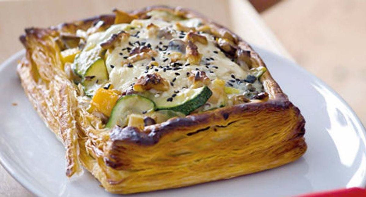 - Retire a massa folhada do forno, solte o quadrado mais pequeno de modo a obter uma caixa e recheie com a mistura de legumes. Por cima distribua a mistura de bechamel e salpique com sementes de sésamo. Leve de novo ao forno para gratinar a superfície.